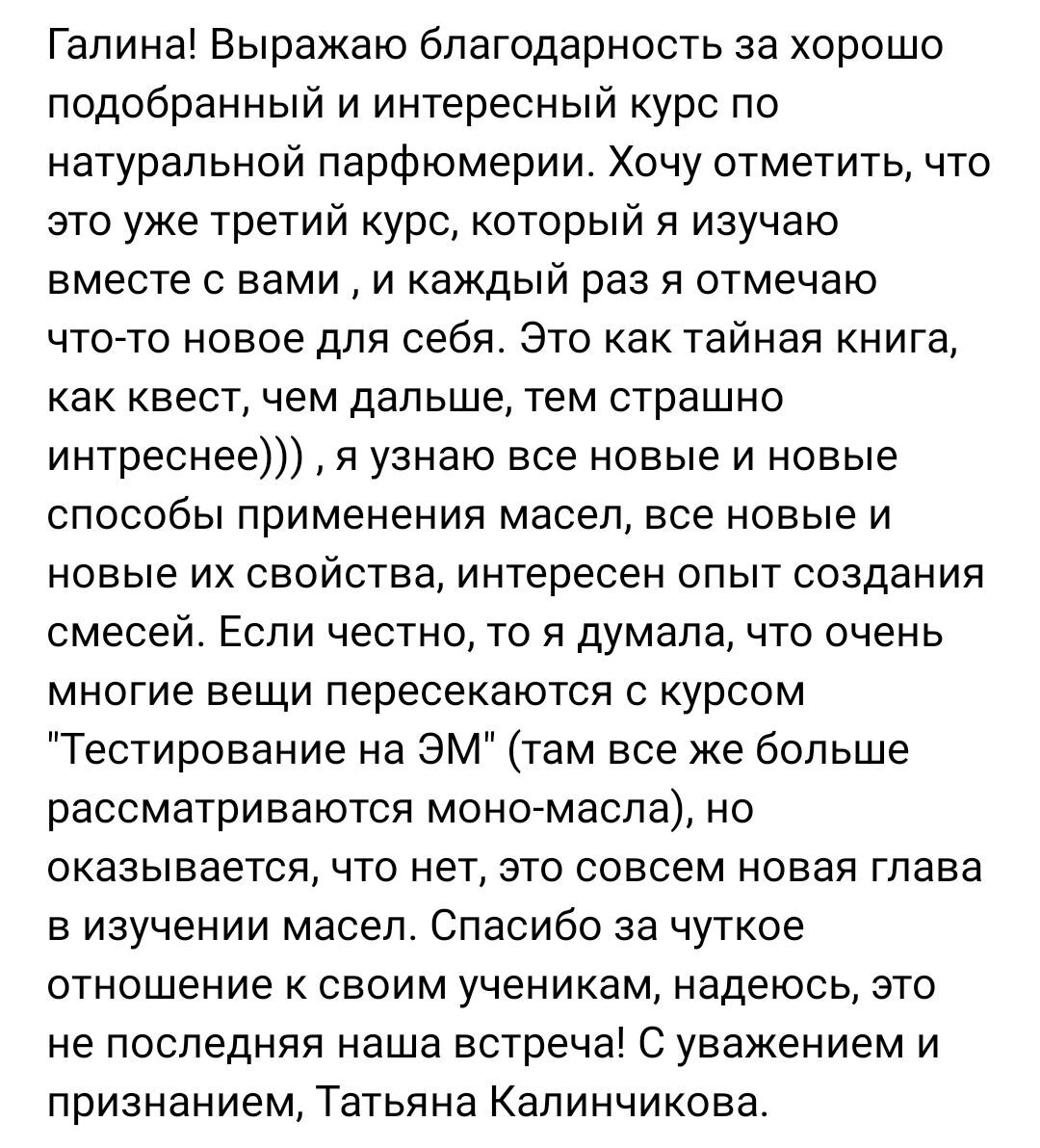 Выражаю свою искреннюю благодарность Галине за очень информативный, полезный, увлекательнейший курс АРОМАПСИХОЛОГИЯ !!! Меня всегда интересовали человеческие отношения, психология, ведическая психология. И теперь, благодаря Галине и ее курсу, я смогу объединить 2 своих увлечения: психологию и ароматерапию. Удивительно, как много могут сказать масла о человеке и его отношениях с миром и людьми! Формат вебинара-это то, что на сегодня для меня, как для мамы маленького ребенка, удобно. Информация четко логично изложена, читается приятным ласковым голосом. Можно задавать вопросы, и Галина щедро делится своими знаниями. Курс полезен не только для психологов, но и для тех, кто желает разобраться в себе, улучшить свою жизнь, помочь себе и другим в выстраивании отношений со своими любимыми, близкими, создания благоприятной атмосферы дома, в бизнесе.. Лично я первым делом буду тестировать себя, свою семью. И хочу создать аромат для укрепления отношений с мужем)) Да-да, это возможно! Этому и многому другому научит Галина! Еще раз благодарю! Буду рада еще поучаствовать в Ваших вебинарах.