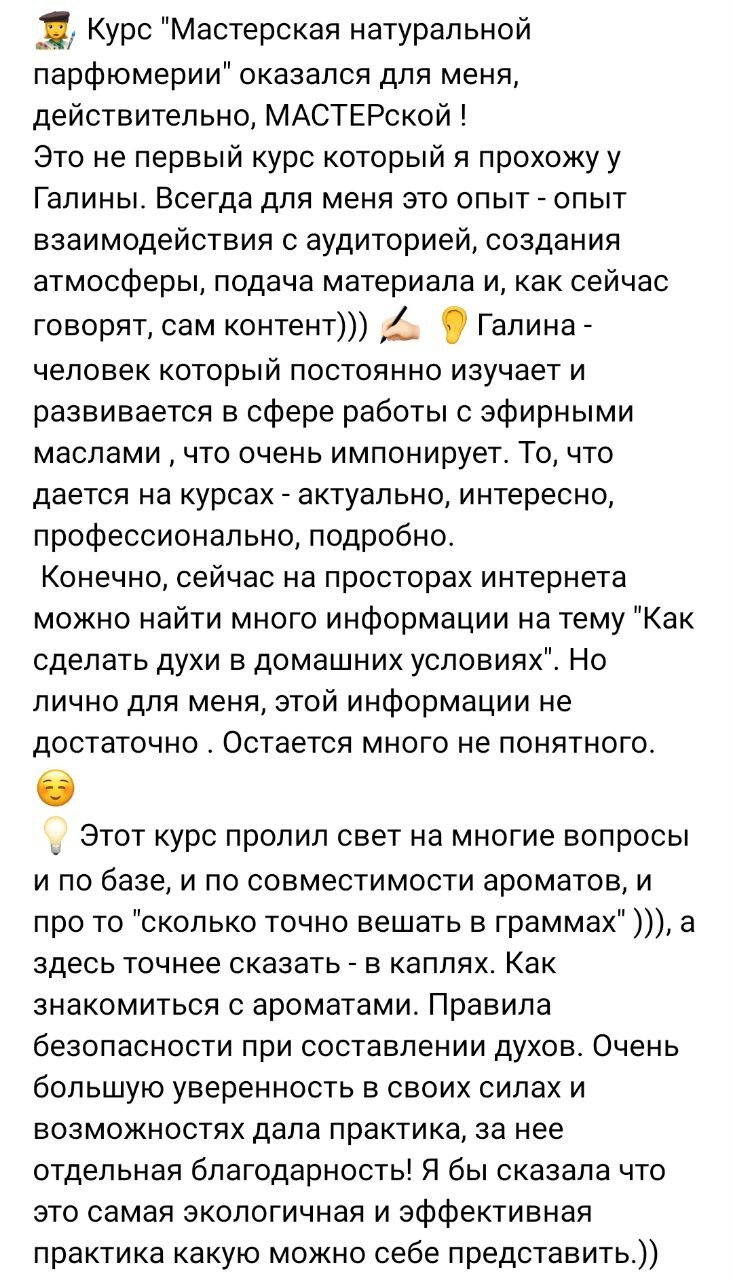 Чудесный, замечательный курс. Слежу за творчеством-работой Галины уже давно. Прослушала , мне кажется, уже почти все её курсы и ни разу не была разочарована. Эфирные масла настолько многогранны, и их влияние на нас настолько обширно, что любое новое их видение и чувствование обязательно должно быть учтено и изучено любителями , пользователями и ароматерапевтами. Именно это и послужило для меня отправной точкой для участия в этом курсе.Что мне дал курс? Новое ощущение масел, новую любовь к ним, новое их понимание и новый метод работы с ними и их использования. Конечно, мандалы были разработаны Галиной, опираясь на её их чувствование и видение. Но это может быть как отправной точкой так и точкой прибытия. Что особенно мне понравилось? Вопросы, умение их ставить, разбивать на подтемы, чтобы по настоящему понять как запрос , так и мандалу, да и действие масла тоже. Домашние задания очень полезны, на мой взгляд. Я тоже, из любопытства, следила за ответами других участниц. Это невероятно, как коллективно-индивидуальная работа подстёгивает и помогает)))) Спасибо огромное, Галина, за эту новую возможность почувствовать масла.