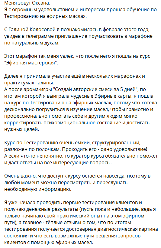 Я очень рада, что попала на обучение к Галине Колосовой. Галина уникальный человек, очень щедрый и открытый. После того, как я заинтересовалась темой аромадиагностики и аромапсихологии, у меня встал вопрос - где взять информацию? У кого и как можно этому обучится? Стала искать. Так как я сейчас внимательно смотрю насколько мне нравится стиль обучения, метод по которому обучают и сама подача материала, то многие курсы и преподаватели у меня в процессе общения отпали сами собой. Не мало важную роль для меня сыграла также доступная цена продукта и возможность пройти обучение онлайн. Галина очень понравилась стилем подачи материала, у нее дар преподавания. Располагает также и то, что она щедро делится своими знаниями, отвечает на все возникающие в процессе обучения вопросы. Для меня весь курс был полезен, материал четко структурирован, что помогает его быстро запоминать. Я искала по большей части психологическую составляющую масел, и курс Галины в этой части просто отличный. В результате прохождения курса кое-какая информация, которую я узнала ранее, начала вставать наконец-то на свои места, до этого я не могла сама разложить в голове все так четко по полочкам. Курс полностью сбалансирован, информации для теории более, чем достаточно :). Все остальное можно наработать только практикой. Понравилось, что были домашние задания, которые затем проверялись. Рекомендую данный курс, вы получите здесь все, что хотели узнать о диагностике с помощью эфирных масел.