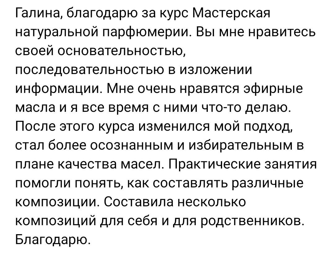 Выражаю свою искреннюю благодарность Галине за очень информативный, полезный, увлекательнейший курс АРОМАПСИХОЛОГИЯ !!! Меня всегда интересовали человеческие отношения, психология, ведическая психология. И теперь, благодаря Галине и ее курсу, я смогу объединить 2 своих увлечения: психологию и ароматерапию. Удивительно, как много могут сказать масла о человеке и его отношениях с миром и людьми! Формат вебинара-это то, что на сегодня для меня, как для мамы маленького ребенка, удобно. Информация четко логично изложена, читается приятным ласковым голосом. Можно задавать вопросы, и Галина щедро делится своими знаниями. Курс полезен не только для психологов, но и для тех, кто желает разобраться в себе, улучшить свою жизнь, помочь себе и другим в выстраивании отношений со своими любимыми, близкими, создания благоприятной атмосферы дома, в бизнесе.. Лично я первым делом буду тестировать себя, свою семью. И хочу создать аромат для укрепления отношений с мужем)) Да-да, это возможно! Этому и многому другому научит Галина! Еще раз благодарю! Буду рада еще поучаствовать в Ваших вебинарах.