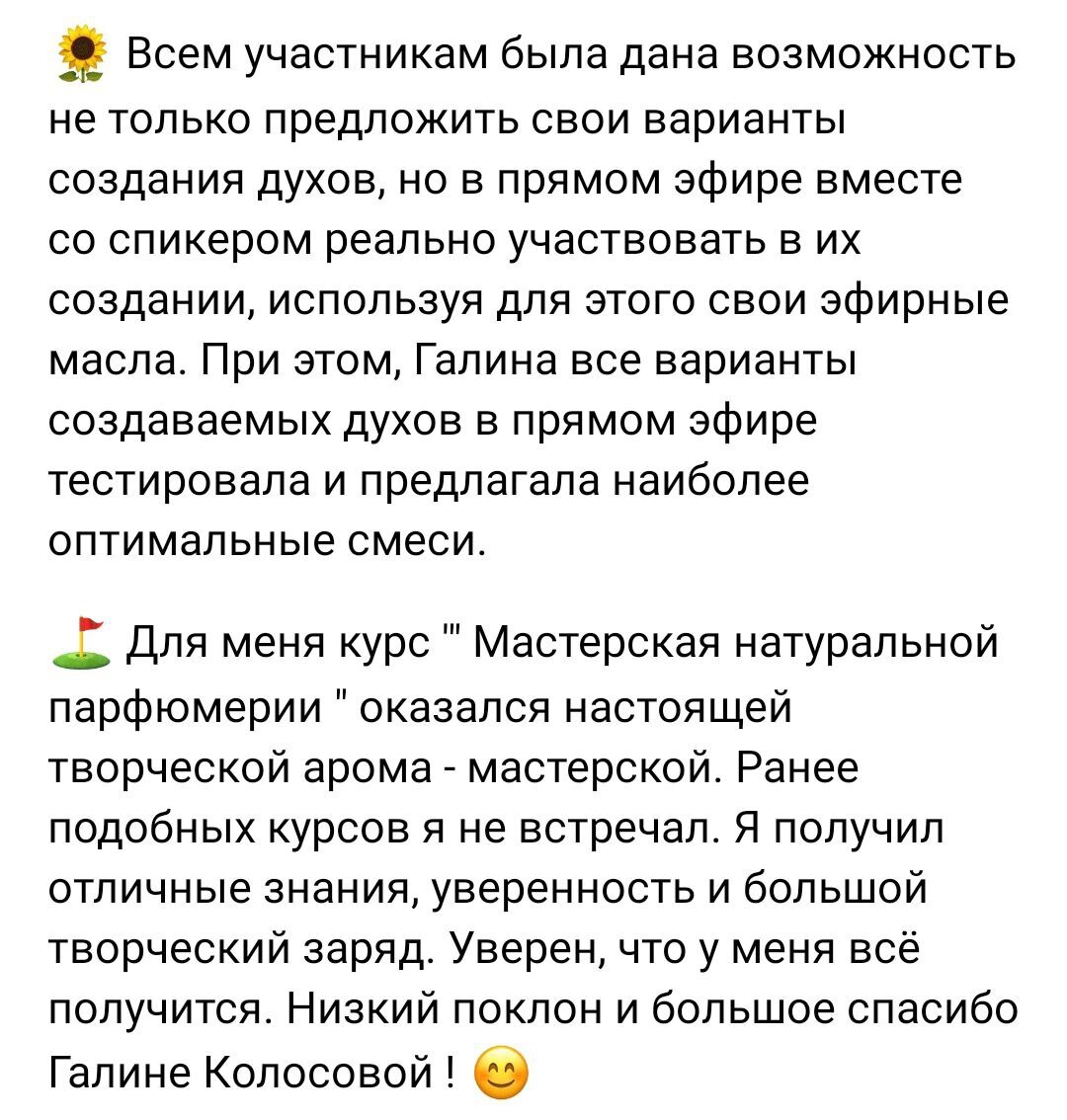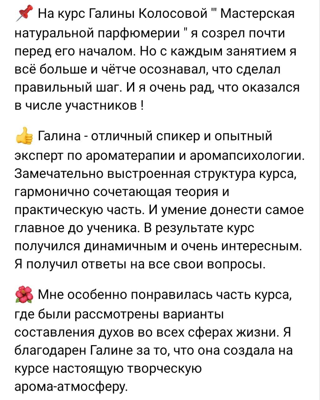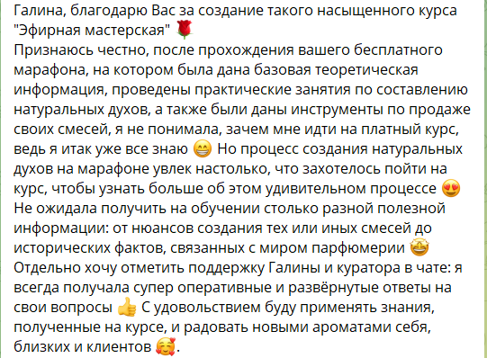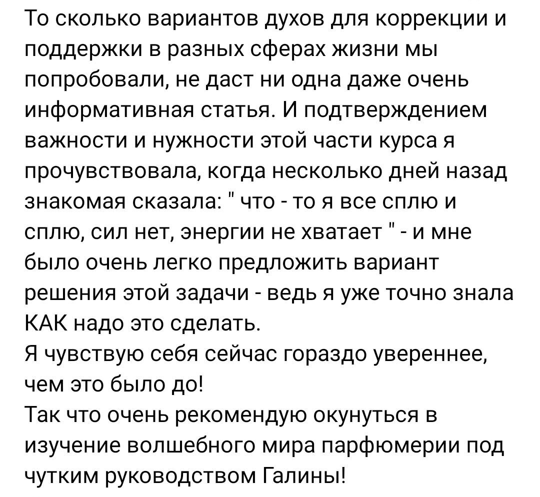 Близко с эфирными маслами я познакомилась немногим более года назад. Информации и рецептов в интернете море. Но хотелось узнать способы применения , нюансы , рецепты от профессионала с опытом. Поэтому я решила принять участие в Арома-Марафоне Галины Колосовой. Каждый "урок" содержателен, информативен. Многое из личного опыта. Все темы Марафона очень интересны, и сложно выделить одну или две. Здоровье важно. Красота важна. Знание определения качества и свойства эфирных и базисных масел тоже важно. И так любая тема, которую Галина раскрывает нам. Материал дается полезный и познавательный, с душой. Рецептов и информации много. Постепенно все уляжется и усвоится. Начала с блока по здоровью, укрепляю иммунитет, и уход за собой с эфирными маслами осваиваю. Приятнейшее занятие ))) Всегда лучше обучаться у специалиста в своем деле. Благодарю Галина