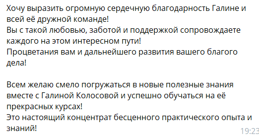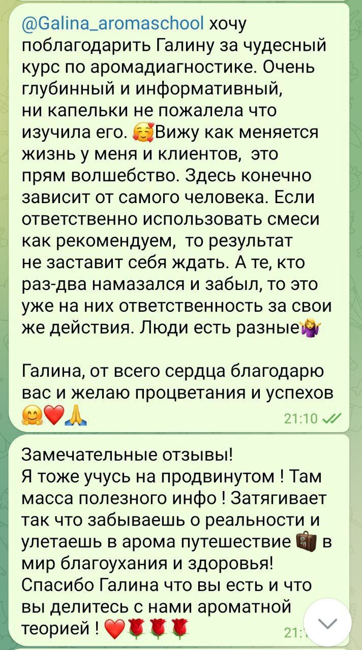 Огромная благодарность Галине за прекрасный курс. Он оправдал все ожидания и даже больше! На курс я давно "медитировала", ещё с арома-игры, очень понравилось как подаётся информация, и хотелось научиться разбираться в маслах и в том, какое масло за что отвечает. Невероятное количество интересной, ценной, полезной информации, которую теперь хочется пробовать применить на практике. С каждого урока остался большой конспект, хотелось записывать буквально каждое слово. После курса осталось ощущение, что теперь все масла разложены "по полочкам", все структурировано и четко. Хотя безусловно я ещё буду много раз переслушивать уроки, потому что протестировала я только троих, включая себя, и это были близкие люди, которых я хорошо знаю, а теперь хочется попробовать с менее знакомыми. Очень интересно расшифровывать бланки. Одним из важных инсайтов стала расшифровка бланка мужа, мне было совершено непонятно, почему он все время вдыхает определенные масла, и только проанализировав в целом, после диагностики, я поняла, что это означает и как соотносится с тем,что сейчас происходит в нашей жизни. Удивительно насколько наш организм умеет сам выбирать то, что ему нужно! Структура курса отлично выстроена. Единственное что было неудобно лично мне и тормозило мое обучение, но здесь абсолютно нет вины Галины, - это технические моменты: у нас в Украине заблокирован ВК и Яндекс и поэтому каждый раз, чтобы скачать урок или посмотреть задание нужно было подключать ВПН. Это безусловно мелочь. Домашние задания полезные и интересные. Мне бы хотелось больше практики, но опять-таки это моя вина,я немного выпадала их обучения по времени. Спасибо большое, Галина, я уверена, что это не последний курс